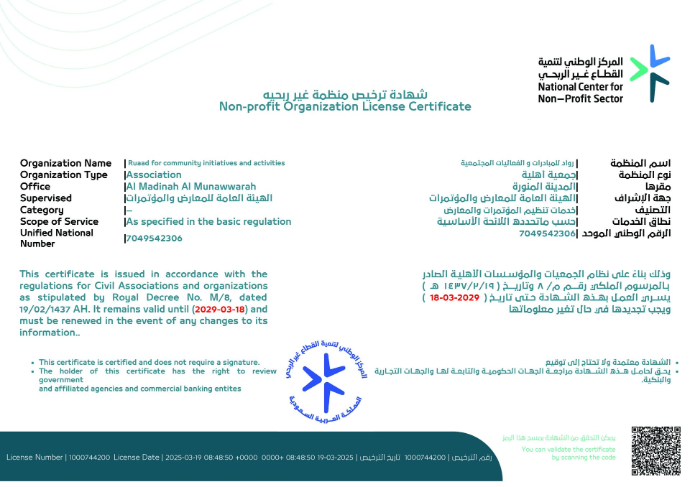 نستعرض هنا الركائز الرئيسة التي تميّز جمعية روّاد للمبادرات والفعاليات المجتمعية من حيث ترخيصها الرسمي، ونطاق عملها، ودورها في تنمية الفعاليات بالمدينة المنورة.